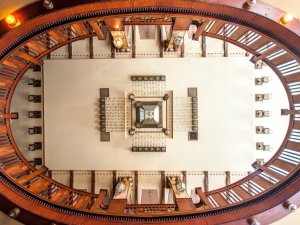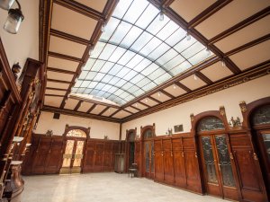 V přízemí hotelu za recepcí se nachází spojovací místnost s průhledem do patra.