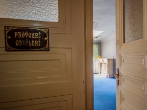 Elegantní je také místnost provozního oddělení v prvním patře hotelu s dochovanou původní cedulkou na dveřích.