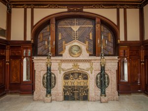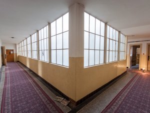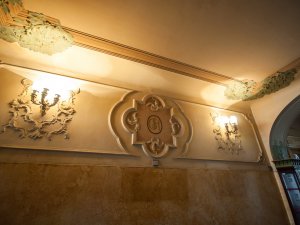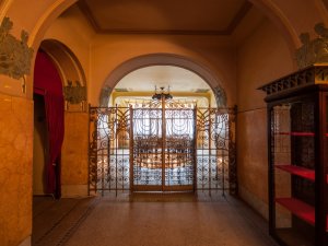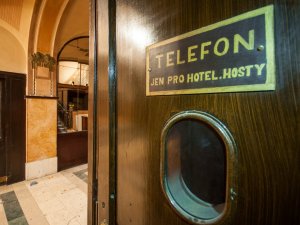 Pojďme nahlédnout do interiérů. Při vstupu nejdříve přivítá krásná chodba s recepcí, původní telefonní budkou a výtahem, který je spíše výsledkem úprav za socialismu.