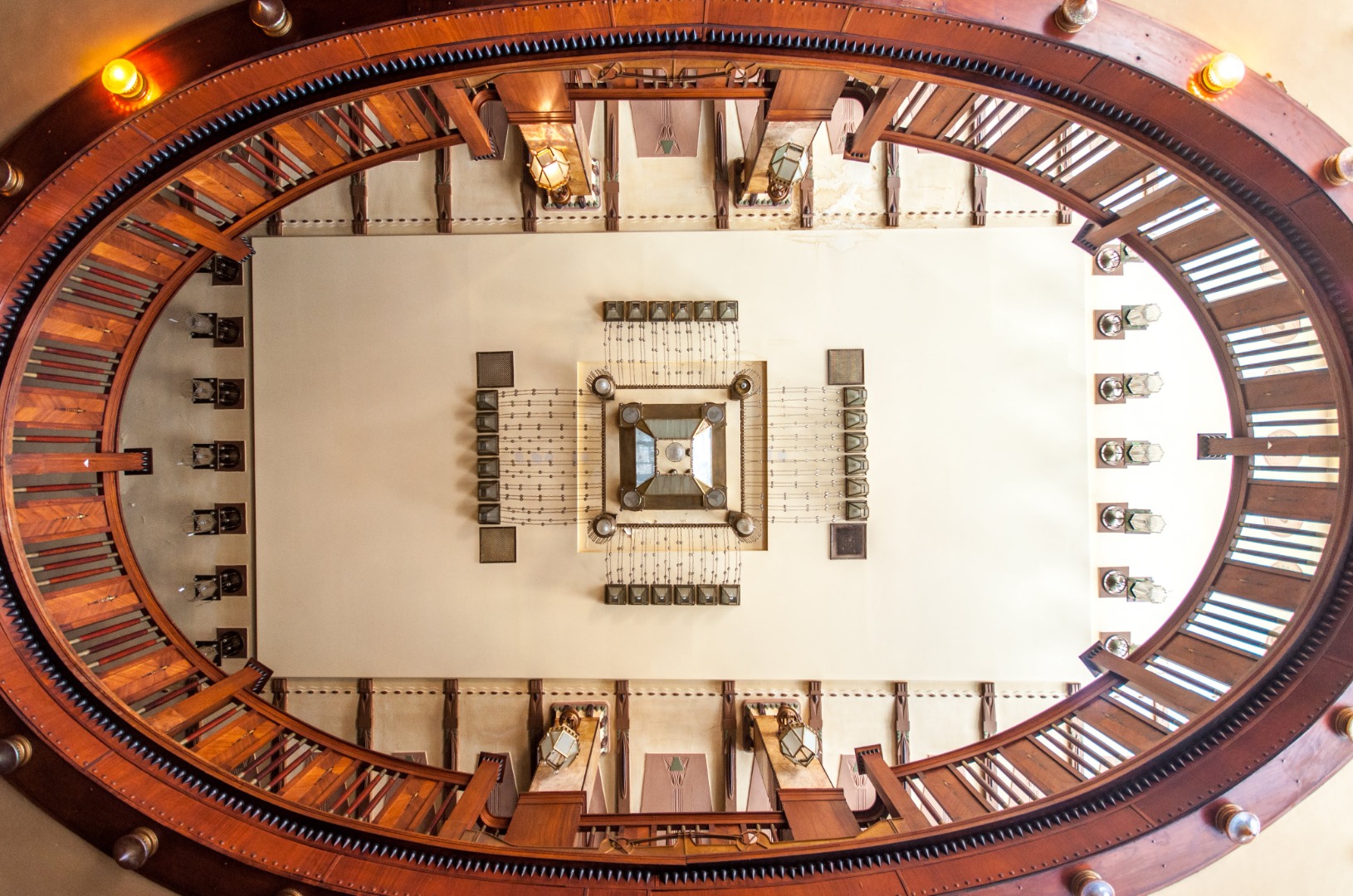 V přízemí hotelu za recepcí se nachází spojovací místnost s průhledem do patra.