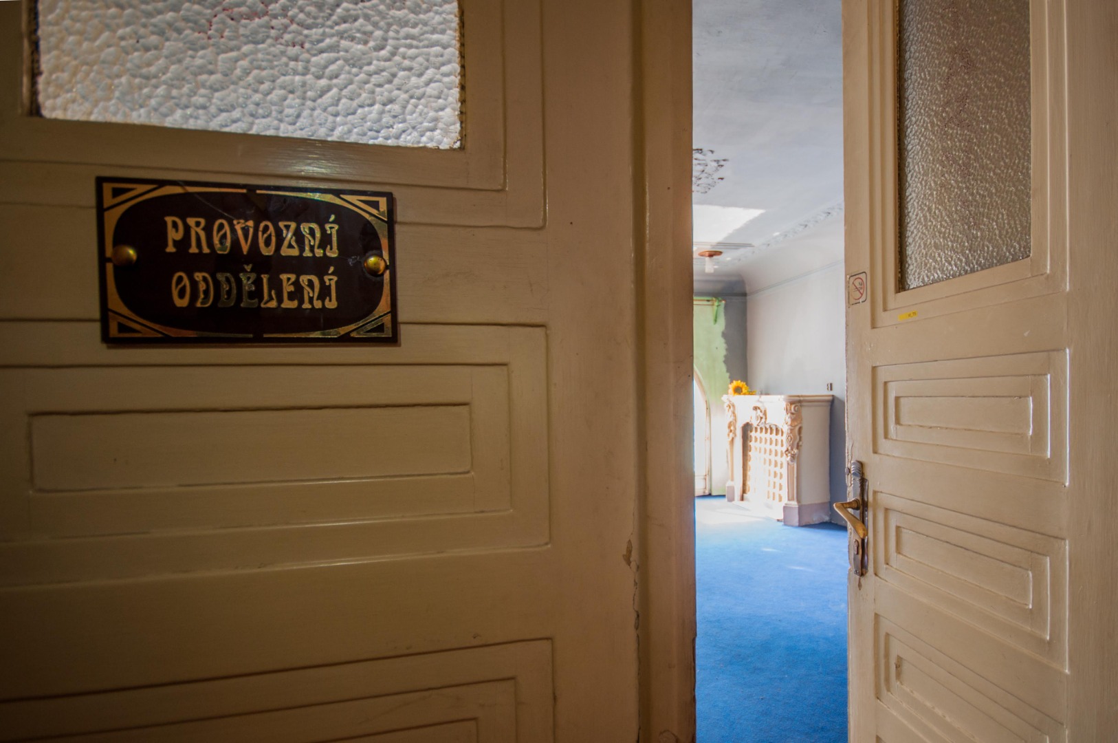 Elegantní je také místnost provozního oddělení v prvním patře hotelu s dochovanou původní cedulkou na dveřích.