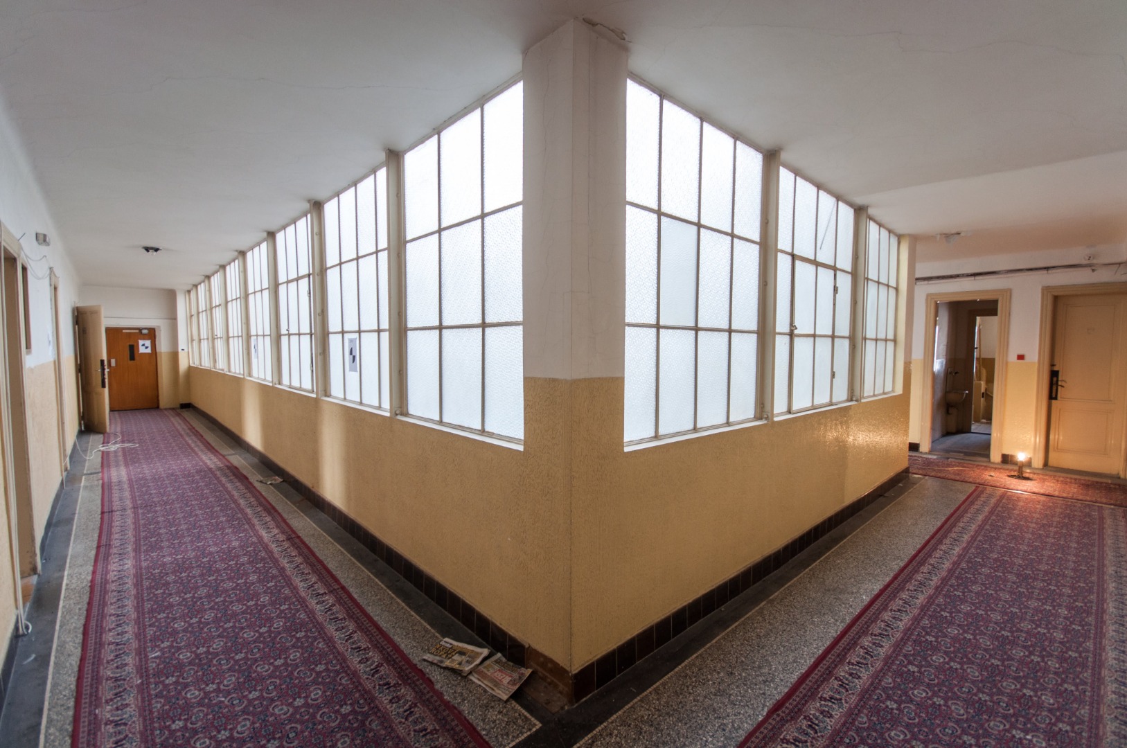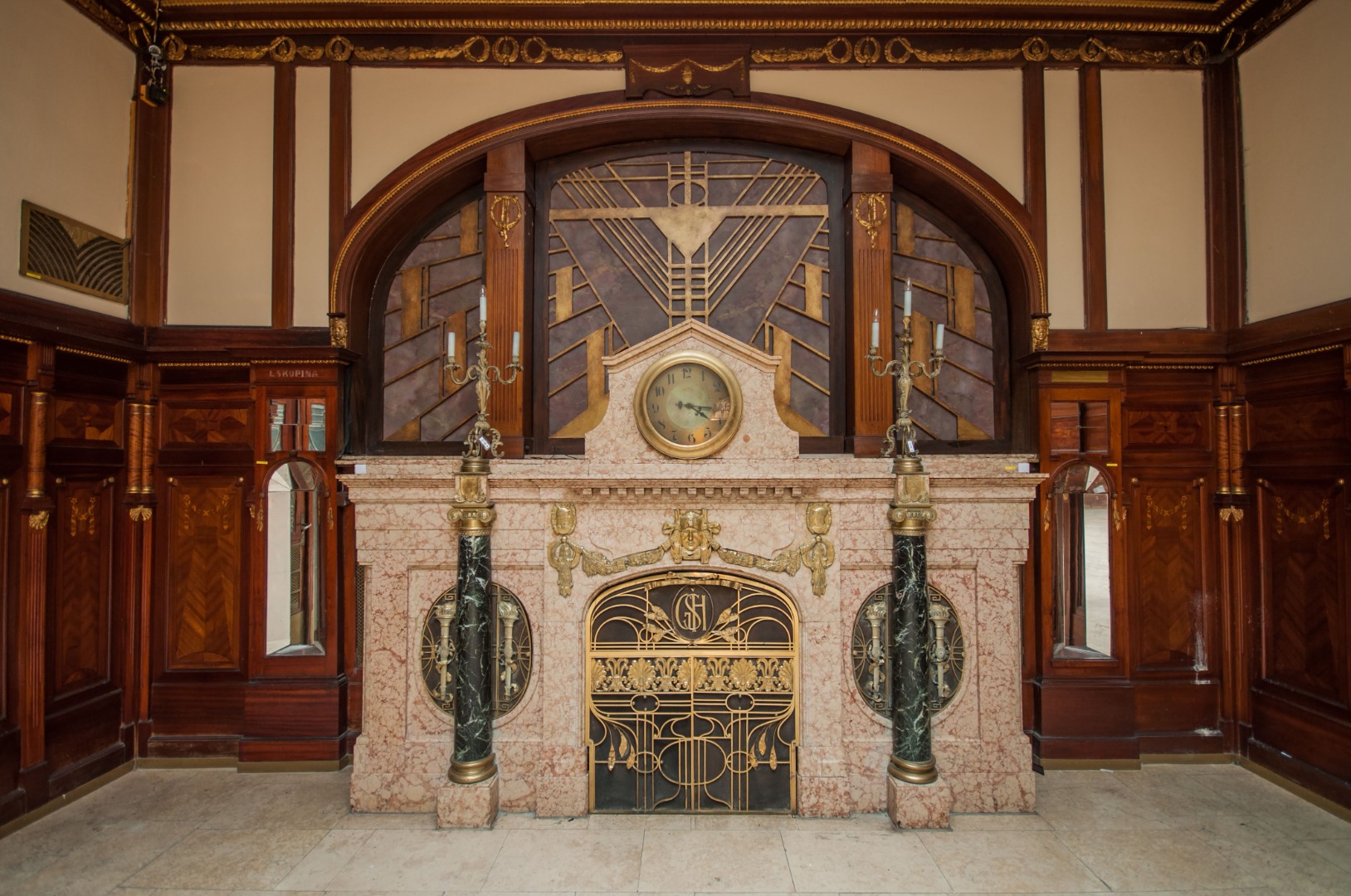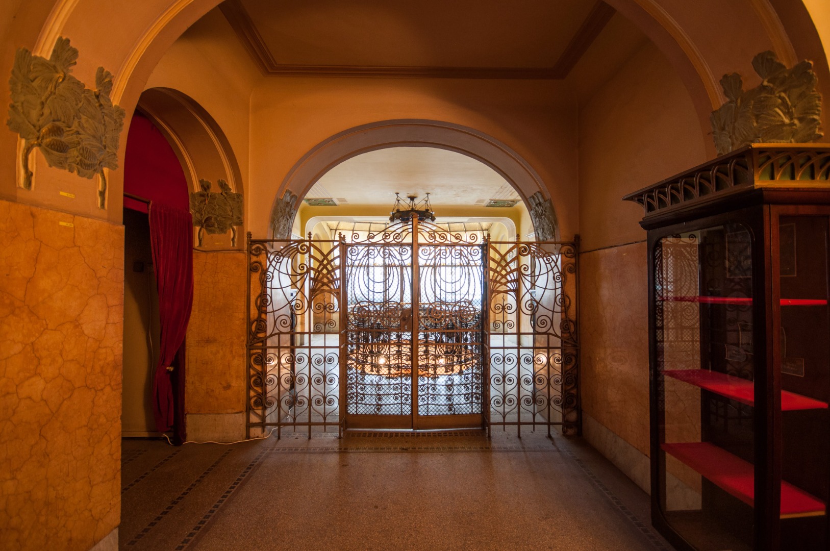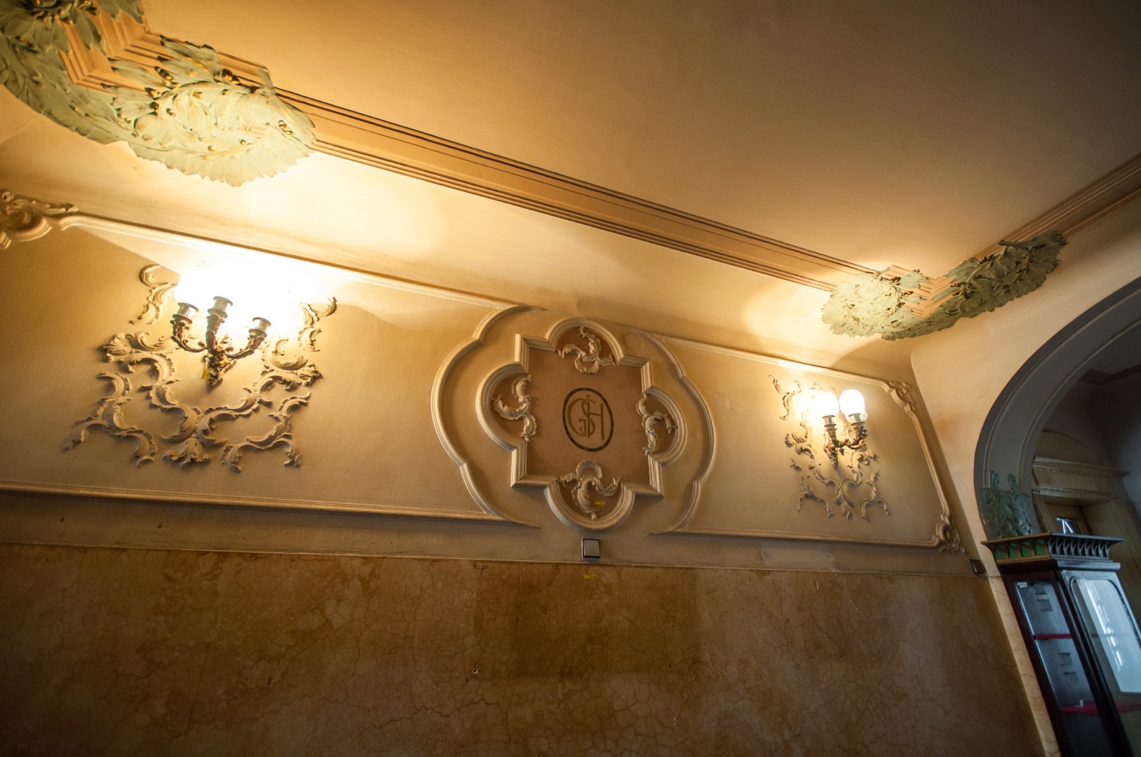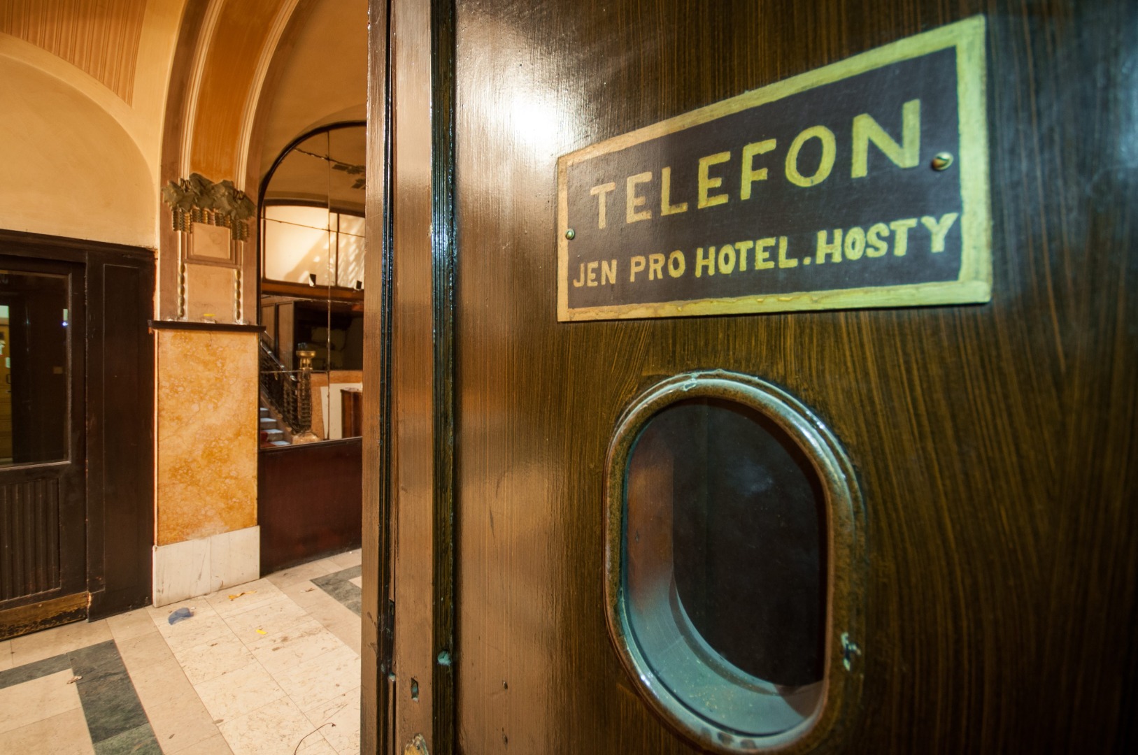 Pojďme nahlédnout do interiérů. Při vstupu nejdříve přivítá krásná chodba s recepcí, původní telefonní budkou a výtahem, který je spíše výsledkem úprav za socialismu.