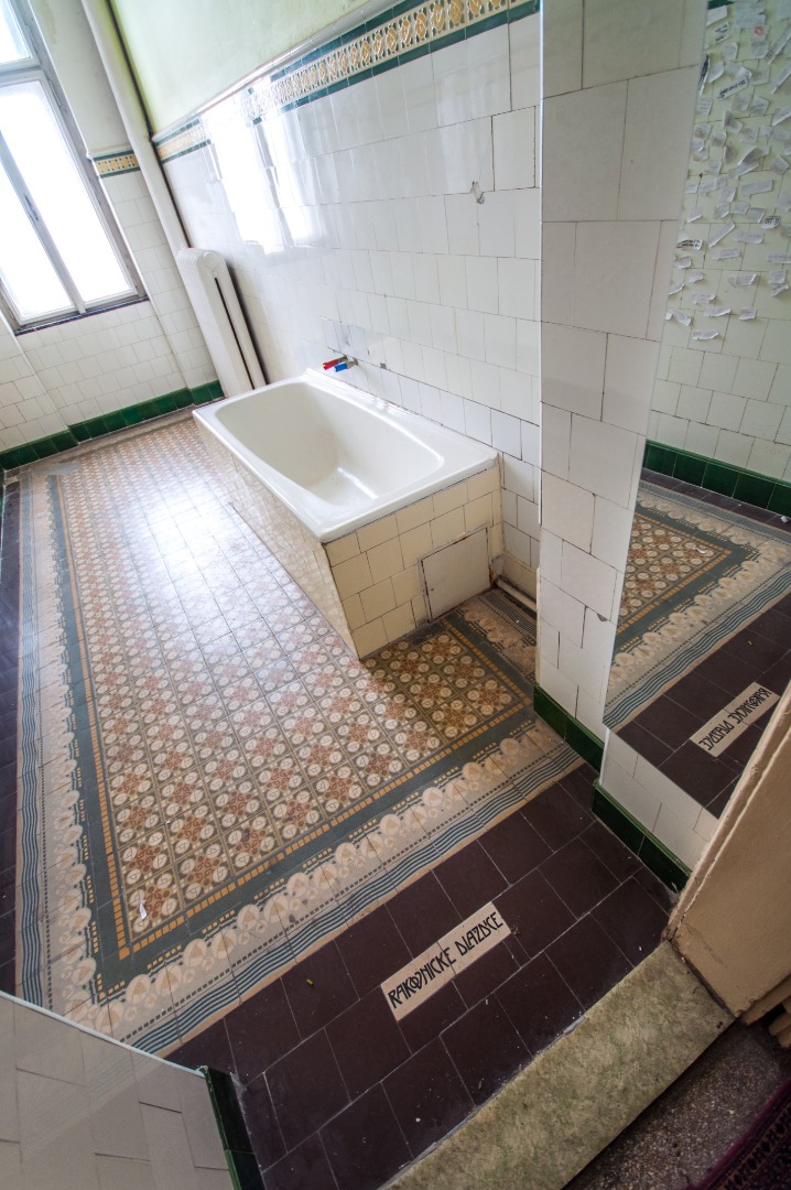 Na dnešní dobu už zejména nevyhovují koupelny, ty jsou ve většině případů společné a mimo hotelové pokoje. To se bude muset po rekonstrukci změnit. Najdeme v nich ale i zajímavé detaily, viz první fotografie a dlažba.