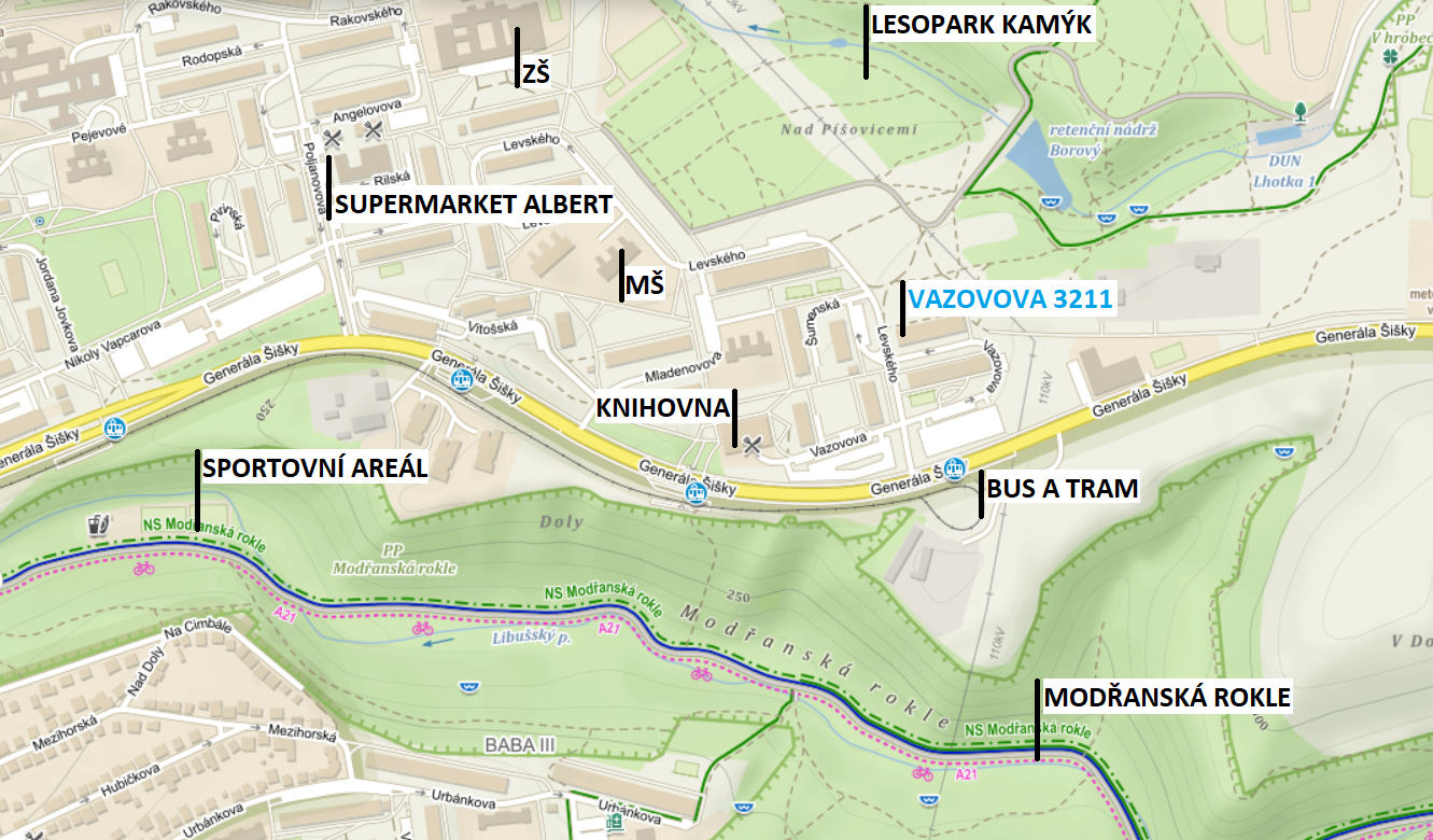 Výborná dopravní obslužnost do centra Prahy - 150 m k tramvajové a autobusové zastávce i s nočními spoji, odkud jste do 20 min v centru Prahy. Na procházky / cvičení láká např. nedaleký lesopark Kamýk se ZOO koutkem, popřípadě z druhé strany přírodní památka údolí Modřanské rokle. V okolí také kompletní občanská vybavenost - ZŠ, MŠ, prodejny potravin, zdravotní středisko, knihovna nebo sportovní areál.